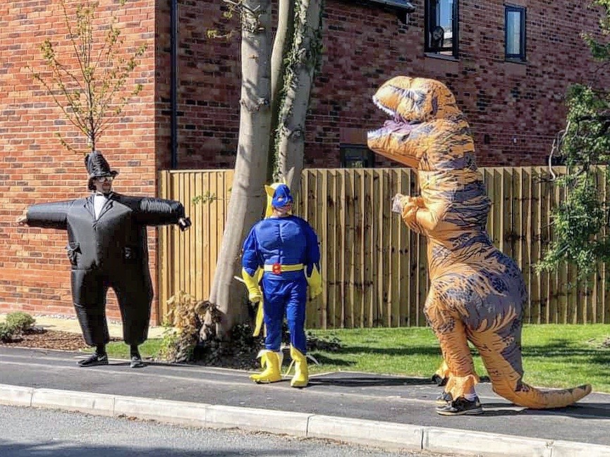 Today was……eventful. My dad and I went out for a distanced walk with some friends, dressed up! My dad was Bananaman, our friend Jon was dressed a Dinosaur and another friend, Jack was dressed as the Fat Controller from Thomas the Tank Engine! We all walked around Wilmslow to cheer people up. Hundreds of people came out to see us and we made the news!